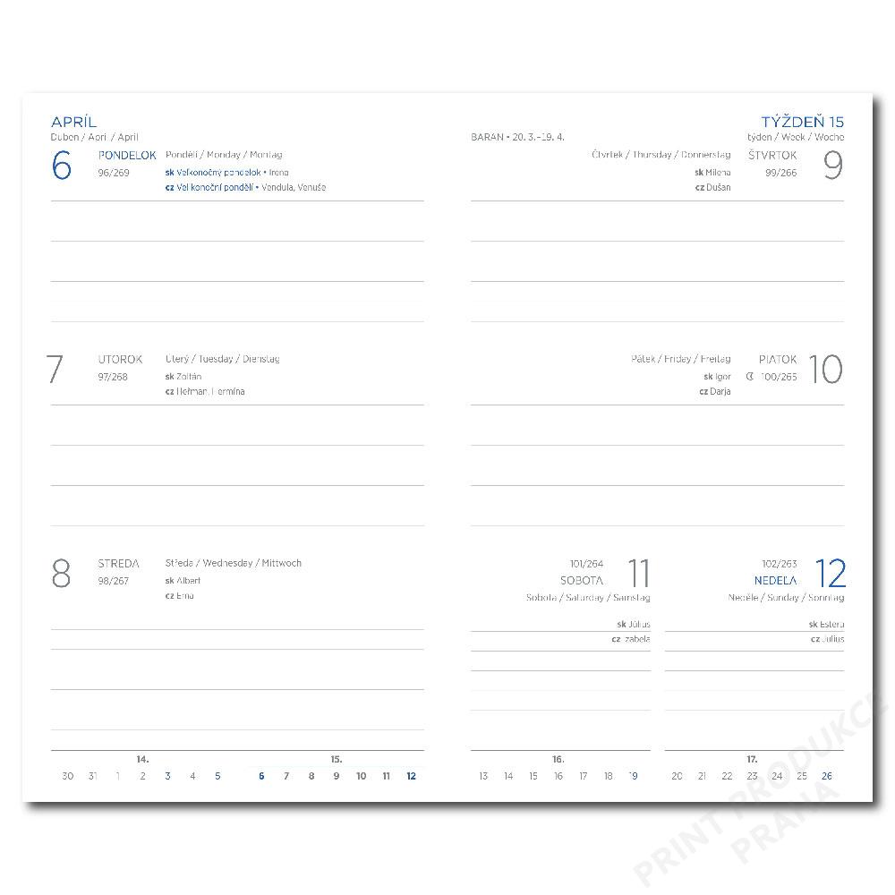 Rozměr: 90 x 150 mm - Kalendárium: slovenské týdenní - Rozsah: 128 stran - Papír: bílý - Materiál desek: kůže - Hlavní jazyk: slovenština - Další jazyky: CZ, EN, DE