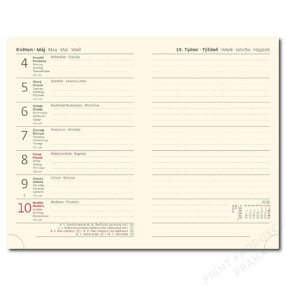 mezinárodní svátky, roční výhled, týdenní layout, adresář.