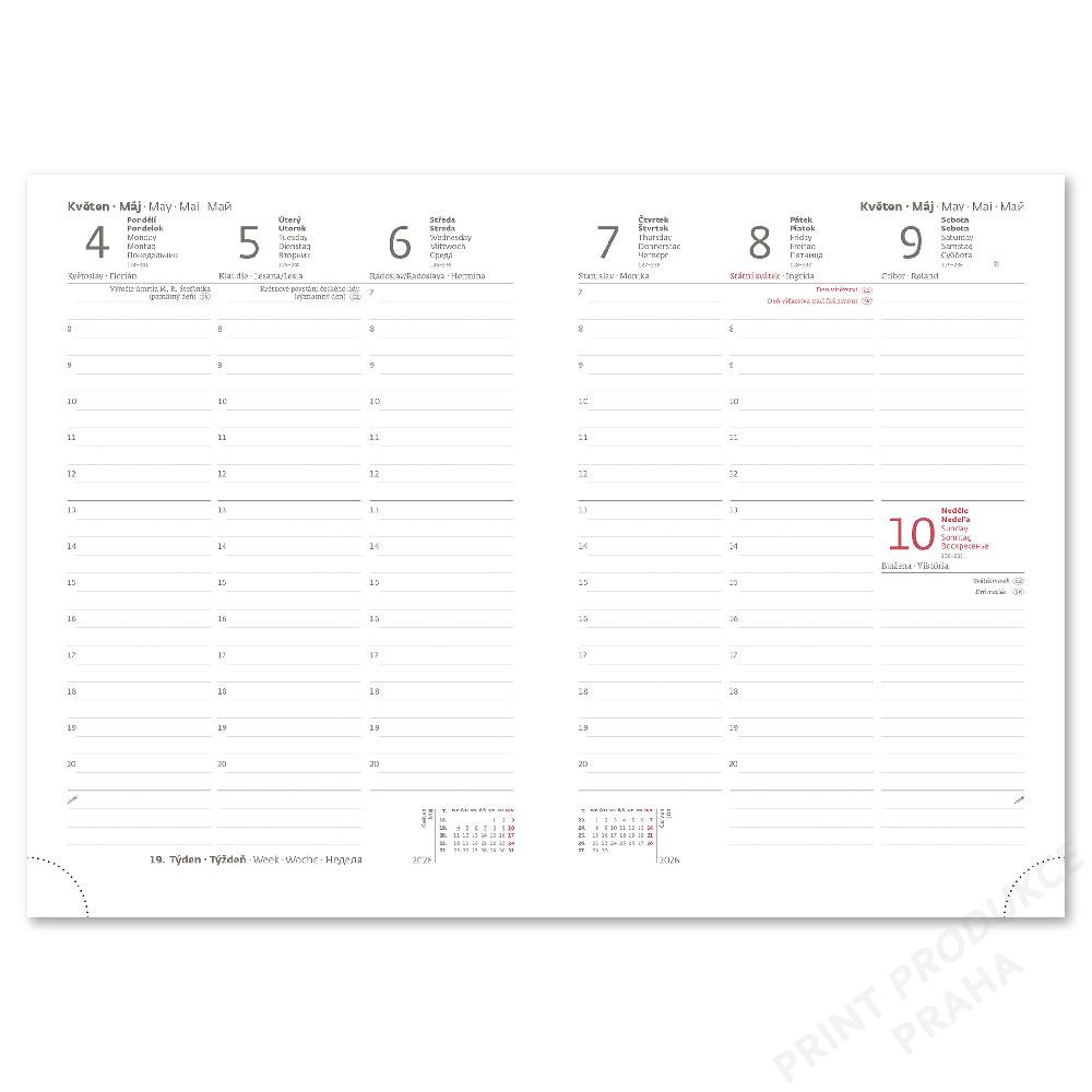 Rozměr: 145 x 205 mm - Formát: A5 - Kalendárium: týdenní české/slovenské - Počet stran: 128 - Barva bloku: bílá - Vazba: V8 - Potahový materiál: matný zušlechtěný papír bez struktury