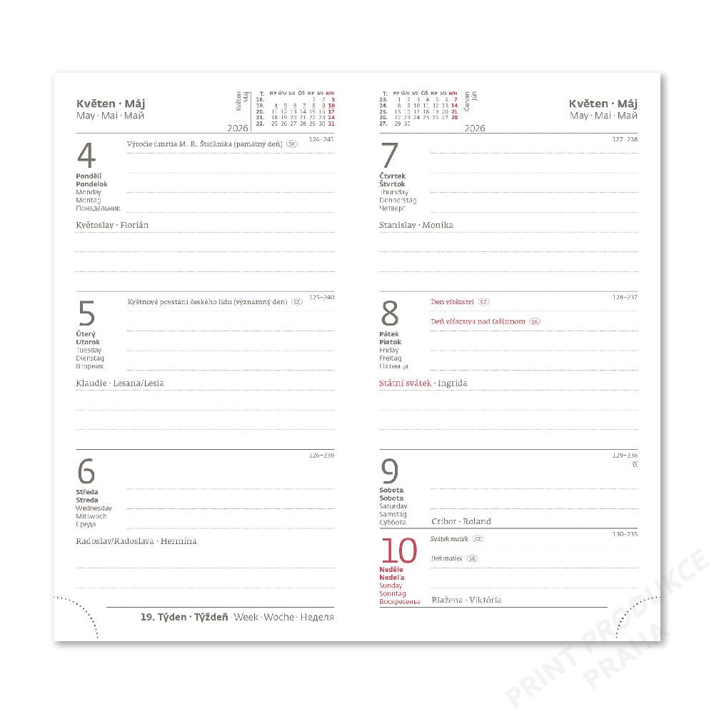 mezinárodní svátky, roční výhled, týdenní layout, adresář.