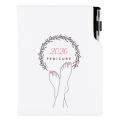 Barva bloku: bílá - Vazba: V8 - Potahový materiál: laminace s hedvábným efektem - - Obsahuje: osobní údaje, plánovač dovolené (měsíční přehled), - plánovací kalendář, telefonní předvolby, státní svátky ČR/SR, - mezinárodní svátky, roční výhled, denní layout, adresář, - mapa Evropy, České a Slovenské republiky. - - Součástí je gumička na zavírání. - Vhodný pro potisk.