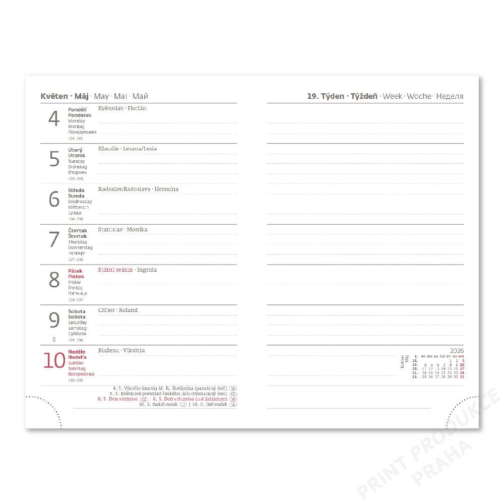 mezinárodní svátky, roční výhled, týdenní layout, adresář. - - Součástí je gumička na zavírání.