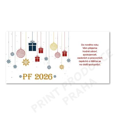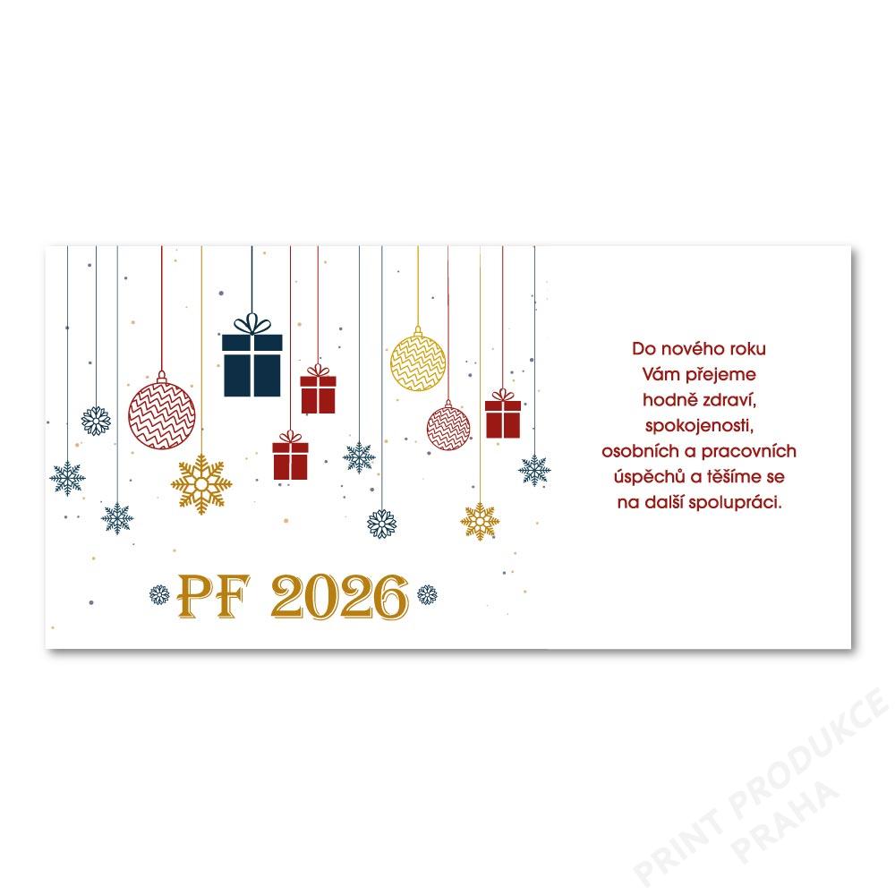 PF 2026 - karta s textem - Rozměr: 20 x 10 cm - Minimální objednací množství: 50 ks - Obsahuje text s přáním. - papír 350g/M2 - Součástí balení je také obálka. - - Nabízíme také možnost potisku novoročenky logem Vaší firmy, který je již zahrnut v ceně. - Vaše logo tak na novoročenky natiskneme zcela ZDARMA! - - Do 249 ks včetně si však účtujeme jednorázový poplatek za graf. práce a úpravy. - Odhadovaná cena prací je v rozmezí 200-500,- Kč dle náročnosti graf. úprav. - Od 250 ks jsou grafické práce až do počtu třech návrhů také zcela ZDARMA!