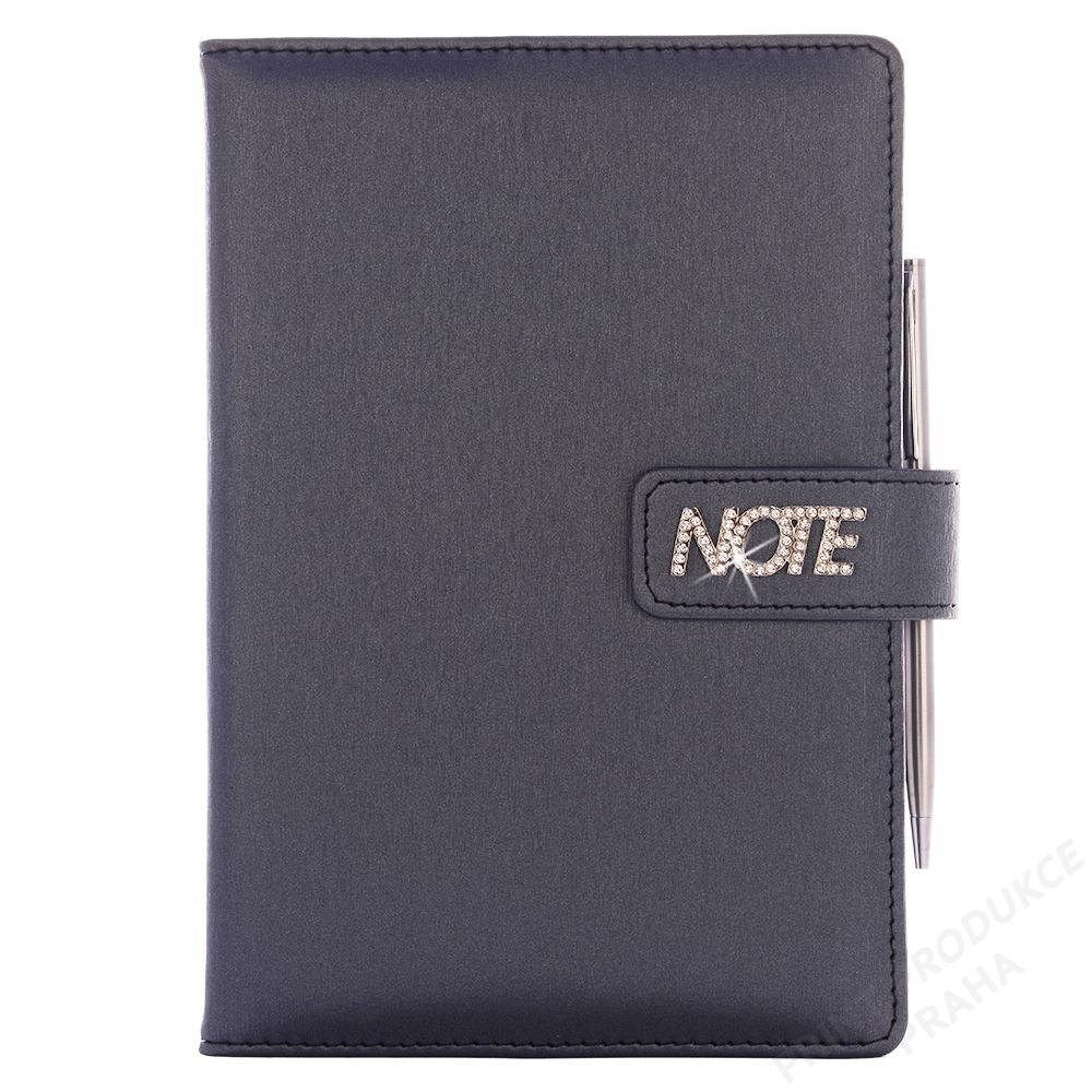 Formát: A5 - Rozměr: 143 x 205 mm - Potahový materiál: povrch imitující stukturu plátna - Vazba: šitá V8 (tkaná niť) - Barva bloku: bílá - Papír: tečkovaný s perforací - Záložka: bílá - Počet stran: 144 - - Šperk Note je vyroben z niklu a v něm jsou vsazeny krystalky. - Součástí je tenké kovové pero a magnetické zavírání. - Notes je balen v dárkové krabičce vystlané saténem.