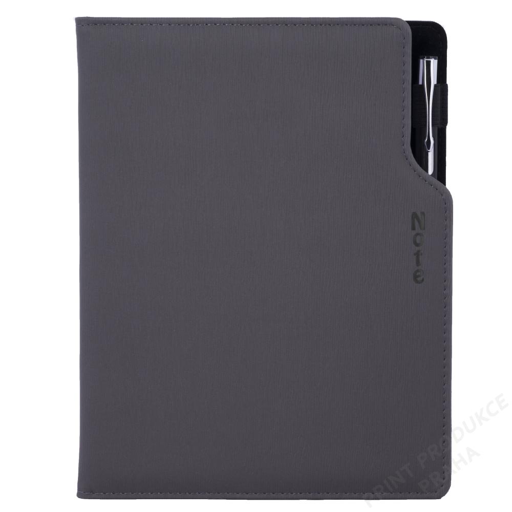 Formát: A5 - Rozměr: 143 x 205 mm - Potahový materiál: matná strukturovaná koženka - Vnitřní materiál: černý samet - Barva bloku: bílá - Záložka: bílá - Papír: tečkovaný s perforací - Počet stran: 144 - Vazba: šitá V8 (tkaná niť) - Součástí notesu je propiska