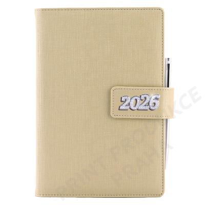Rozsah: 142 stran - Vazba: šitá V8 (tkaná nit) - Kalendárium: týdenní české jmenné - Jazykové mutace: CZ, SK, EN, DE, RU - Barva bloku: bílá - Barva písma: modrá a červená - Diář obsahuje: kulaté odtrhávací rožky, bílou záložku, - kovovou propisku a magnetické zavírání - Potahový materiál: koženka - - Obsah kalendária: znamení zvěrokruhu, přehledný kalendář, - plánovací kalendář 2026, roční plánovací kalendář CZ a SK, - přehled přiznání a plateb daní CZ a SK, poznámky, - mezinárodní tel. spojení, CZ křestní jména, časová pásma, - státní a církevní svátky ve světě, vzdálenosti v km EU/CZ/SK, - plánovací kalendář 2027, mapy - ČR, SK, Praha, Bratislava. - - Šperk letopočtu je vyroben z niklu a v něm jsou vsazeny krystalky. - Diář je balen v dárkové krabičce vystlané saténem.