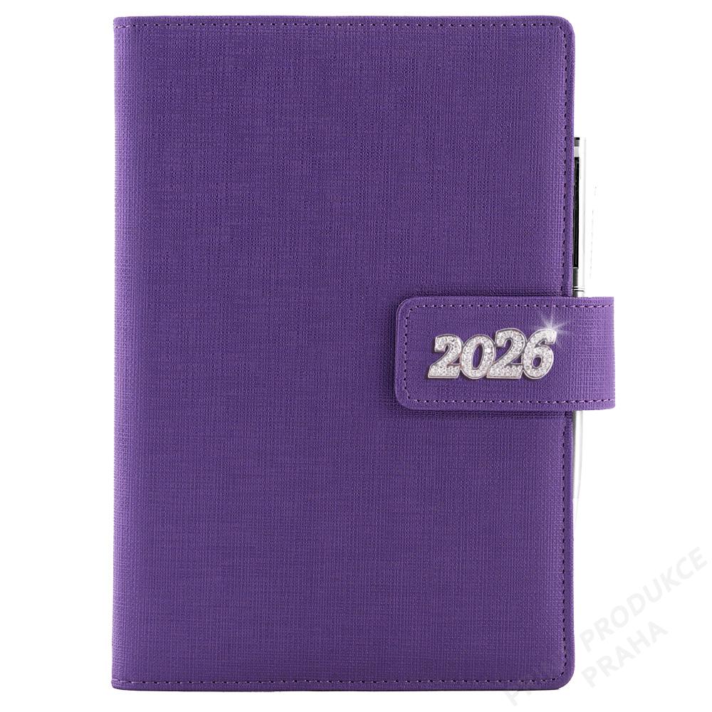 Blok vkládaný do desek diáře - Rozsah: 354 stran - Vazba: šitá V8 (tkaná nit) - Kalendárium: denní slovenské jmenné - Jazykové mutace: SK, CZ, EN, DE, RU - Barva bloku: bílá - Barva písma: modrá a červená - Diář obsahuje: kulaté odtrhávací rožky, bílou záložku, - kovovou propisku a magnetické zavírání - Potahový materiál: koženka - - Obsah kalendária: znamení zvěrokruhu, přehledný kalendář, - plánovací kalendář 2026, roční plánovací kalendář SK a CZ, - přehled přiznání a plateb daní SK a CZ, - mezinárodní tel. spojení, SK křestní jména, časová pásma, - státní a církevní svátky ve světě, vzdálenosti v km EU/SK/CZ, - plánovací kalendář 2027, poznámky, mapy - SK, ČR, Praha, Bratislava. - - Šperk letopočtu je vyroben z niklu a v něm jsou vsazeny krystalky. - Diář je balen v dárkové krabičce vystalné saténem.