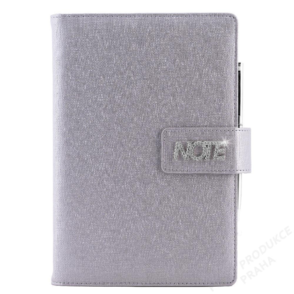 Formát: A5 - Rozměr: 143 x 205 mm - Potahový materiál: koženka - Vazba: šitá V8 (tkaná niť) - Barva bloku: bílá - Papír: tečkovaný s perforací - Záložka: bílá - Počet stran: 144 - - Šperk Note je vyroben z niklu a v něm jsou vsazeny krystalky. - Součástí je tenké kovové pero a magnetické zavírání. - Notes je balen v dárkové krabičce vystlané saténem.
