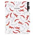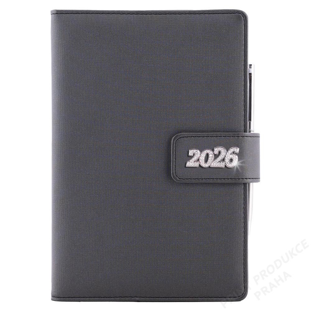 Rozsah: 140 stran - Vazba: šitá V8 (tkaná nit) - Kalendárium: týdenní jmenné CZ/SK na jedné straně + strana na poznámky - Jazyky: CZ, SK, EN, DE, RU - Barva bloku: bílá - Barva písma: modrá a červená - Diář obsahuje: kulaté odtrhávací rožky,bílou záložku, - kovovou propisku a magnetické zavírání - Potahový materiál: povrch imitující stukturu plátna - - Obsah kalendária: znamení zvěrokruhu, přehledný kalendář, - plánovací kalendář 2026, roční plánovací kalendář CZ a SK, - přehled přiznání a plateb daní CZ a SK, časová pásma, - mezinárodní tel. spojení, CZ/SK křestní jména, poznámky, - státní a církevní svátky ve světě, vzdálenosti v km EU/CZ/SK, - plánovací kalendář 2027, mapy - ČR, SK, Praha, Bratislava. - - Šperk letopočtu je vyroben z niklu a v něm jsou vsazeny krystalky. - Diář je balen v dárkové krabičce vystlané saténem.