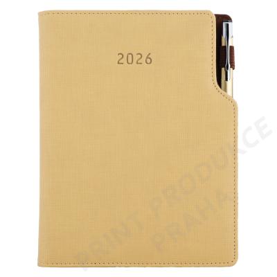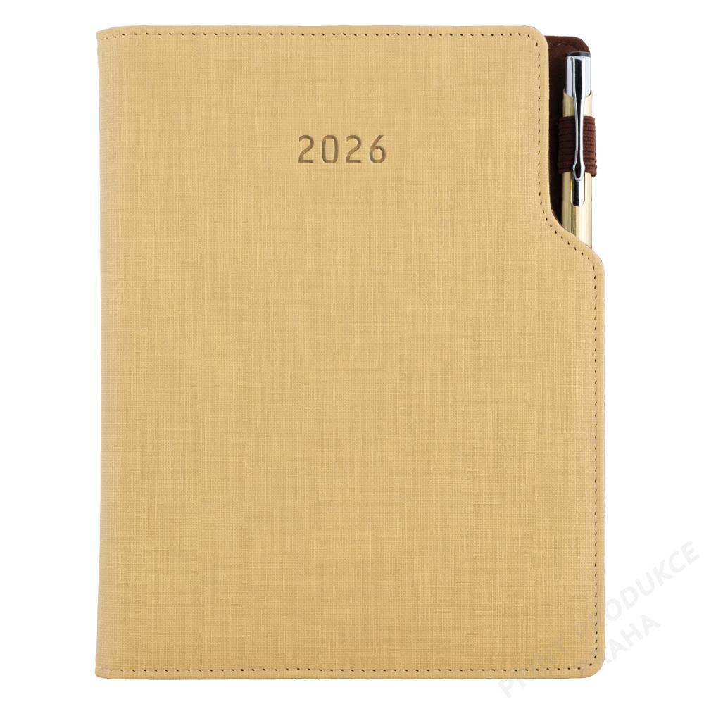 Rozsah: 144 stran - Vazba: šitá V8 (tkaná nit) - Kalendárium: týdenní české a slovenské jmenné - Jazykové mutace: CZ, SK, EN, DE, RU - Barva bloku: bílá - Barva písma: modrá a červená - Diář obsahuje: kulaté odtrhávací rožky, bílou záložku a propisku - Materiál vnější: pěnová výplň desky potažená matnou strukturovanou koženkou - Materiál vnitřní: hnědý samet - - Obsah kalendária: znamení zvěrokruhu, přehledný kalendář, plánovací kalendář 2026, - roční plánovací kalendář CZ a SK, přehled přiznání a plateb daní CZ a SK, - mezinárodní tel. spojení, CZ/SK křestní jména, časová pásma, - státní a církevní svátky ve světě, vzdálenosti v km EU/CZ/SK, - plánovací kalendář 2027, poznámky, mapy - ČR, SK, Praha, Bratislava. - - Součástí je sleporažba letopočtu. - Diář je vhodný pro sleporažbu, ražbu přes folii nebo barevnou ražbu.