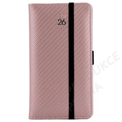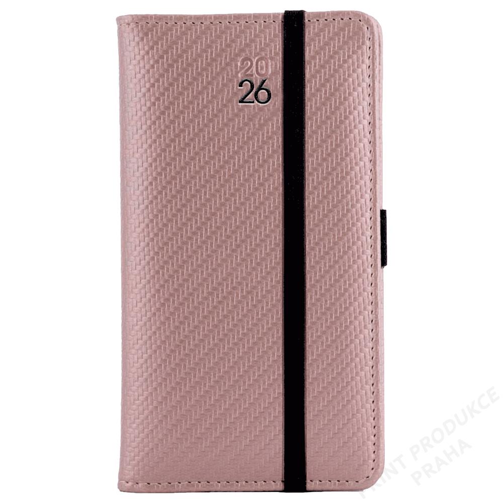 Rozsah: 140 stran - Vazba: šitá V8 (tkaná nit) - Kalendárium: týdenní české jmenné - Jazykové mutace: CZ, SK, EN, DE, RU - Barva bloku: bílá - Barva písma: modrá a červená - Diář obsahuje: kulaté odtrhávací rožky, bílou záložku, - poutko na propisku a gumičku za zavírání - Materiál: pevné desky potaženy vzorovanou matnou koženkou - - Obsah kalendária: znamení zvěrokruhu, přehledný kalendář, - plánovací kalendář 2026, roční plánovací kalendář CZ a SK, - přehled přiznání a plateb daní CZ a SK, mezinárodní tel. spojení, - státní a církevní svátky ve světě, CZ křestní jména, - vzdálenosti v km EU/CZ/SK, plánovací kalendář 2027, - poznámky, časová pásma - - Součástí je barevná ražba letopočtu. - Diář je vhodný pro sleporažbu a barevnou ražbu.