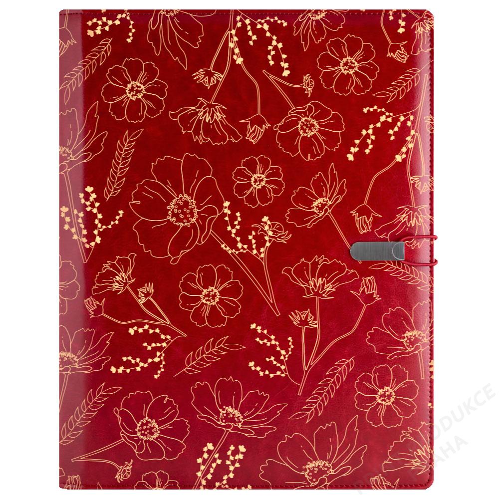 GEP konferenční desky na dokumenty v dárkové krabičce bordó - květiny s linkovaným blokem - Tyto desky jsou ideálním pomocníkem k pořizování poznámek. - Jsou vhodné také jako reprezentativní dárek zabalený v luxusní krabičce. - Do desek GEP je možno dokupovat další náhradní bloky. - Jsou vhodné k reklamní ražbě log, k potisku, ke gravírování atd… - Na desky umíme jako jediní na světě i plnobarevnou ražbu. - Jsou vybaveny estetickým zapínáním na gumičku s kovovým štítkem. - Bloky do desek je možno vyrobit na zakázku s grafikou klienta. (od 100 ks) - Propisku můžeme na přání potisknout. - Na zakázku můžeme desky vyrobit i z jiných potahových materiálů a barev. - - - Konferenční desky GEP standardně obsahují: - - Koženkové desky o rozměru 24,5 x 31,5 cm (vnější rozměr) - - linkovaný A4 s 50 ti stranami - - zapínání na gumičku s kovovým štítkem - - vnitřní přihrádku na dokumenty - - 2 x přihrádku na karty, vizitky aj. - - 2 x poutko na propisku - - luxusní dárkovou krabičku vhodnou k potisku