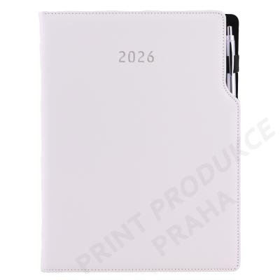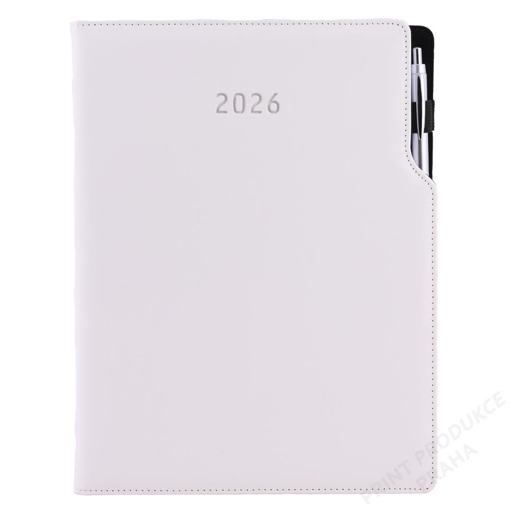 Rozsah: 144 stran - Vazba: šitá V8 (tkaná nit) - Kalendárium: týdenní české a slovenské jmenné - Jazykové mutace: CZ, SK, EN, DE, RU - Barva bloku: bílá - Barva písma: modrá a červená - Diář obsahuje: kulaté odtrhávací rožky, bílou záložku a propisku - Materiál vnější: pěnová výplň desky potažená lesklou hladkou koženkou - Materiál vnitřní: černý samet - - Obsah kalendária: znamení zvěrokruhu, přehledný kalendář, plánovací kalendář 2026, - roční plánovací kalendář CZ a SK, přehled přiznání a plateb daní CZ a SK, - mezinárodní tel. spojení, CZ/SK křestní jména, časová pásma, - státní a církevní svátky ve světě, vzdálenosti v km EU/CZ/SK, - plánovací kalendář 2027, poznámky, mapy - ČR, SK, Praha, Bratislava. - - Součástí je sleporažba letopočtu. - Diář je vhodný pro potisk, sleporažbu, ražbu přes folii nebo barevnou ražbu. - - SOUČÁSTÍ DIÁŘE JE JINÉ KULIČKOVÉ PERO, NEŽ JE VYOBRAZENO NA FOTKÁCH. - KÓD KULIČKOVÉHO PERA - Isabel B0116411PB2