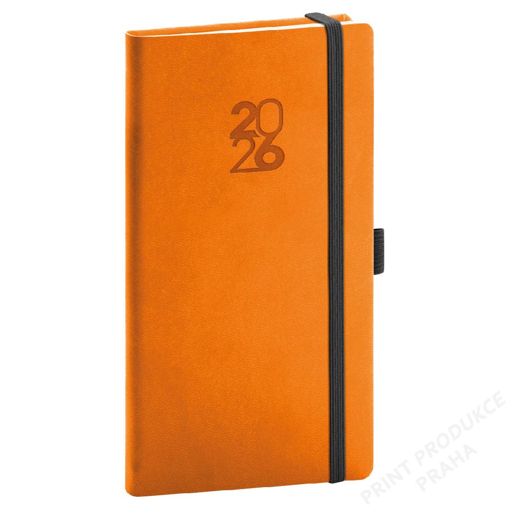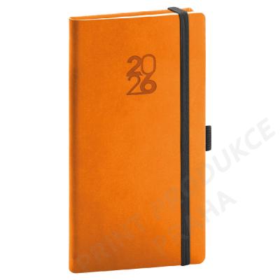 Rozměr: 9 x 15,5 cm - Formát: kapesní - Kalendárium: 6jazyčné týdenní (CZ, SK, EN, DE, HU, RU) - Počet stran: 128 stran - Potahový materiál: hladká matná koženka - Vazba: tuhá knižní - Barva bloku: bílá - - Diář obsahuje: místo pro osobní údaje, - roční plánování 2026 a 2027, pracovní plánovací kalendář, - svátky ČR/ SK + mezinárodní svátky, rozšířený seznam českých jmen. - - Součástí je ražba roku, gumička na zavření a poutko na pero. - Vhodný pro ražbu, ražbu přes folii, barevnou ražbu a potisk.