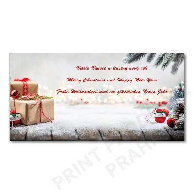 PF 2026 - karta s textem - Rozměr: 20 x 10 cm - Minimální objednací množství: 20 ks - Obsahuje text s přáním. - papír 350g/M2 - Součástí balení je také obálka. - - Nabízíme také možnost potisku novoročenky logem Vaší firmy, který je již zahrnut v ceně. - Vaše logo tak na novoročenky natiskneme zcela ZDARMA! - - Do 249 ks včetně si však účtujeme jednorázový poplatek za graf. práce a úpravy. - Odhadovaná cena prací je v rozmezí 200-500,- Kč dle náročnosti graf. úprav. - Od 250 ks jsou grafické práce až do počtu třech návrhů také zcela ZDARMA!