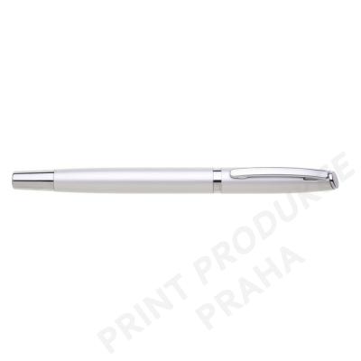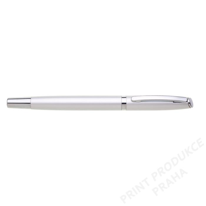 Hliníkový roller v matně stříbrné barvě má stříbrné doplňky a odnímatelné víčko. Náplň keramická, modře píšící